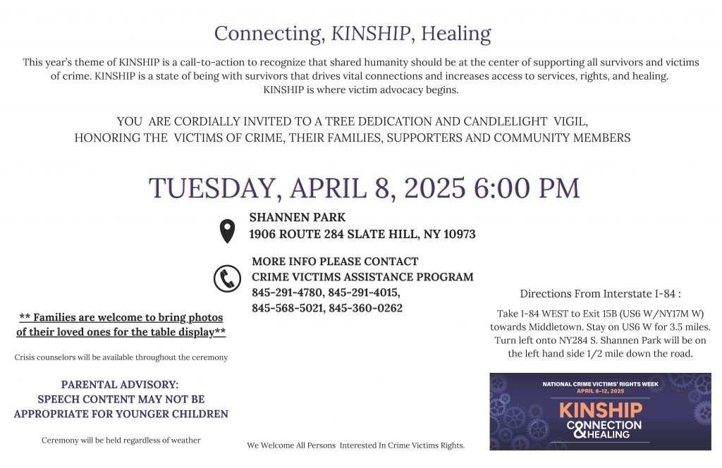 This year’s theme of KINSHIP is a call-to-action to recognize that shared humanity should be at the center of supporting all survivors and victims of crime. KINSHIP is a state of being with survivors that drives vital connections and increases access to services, rights, and healing. KINSHIP is where victim advocacy begins.