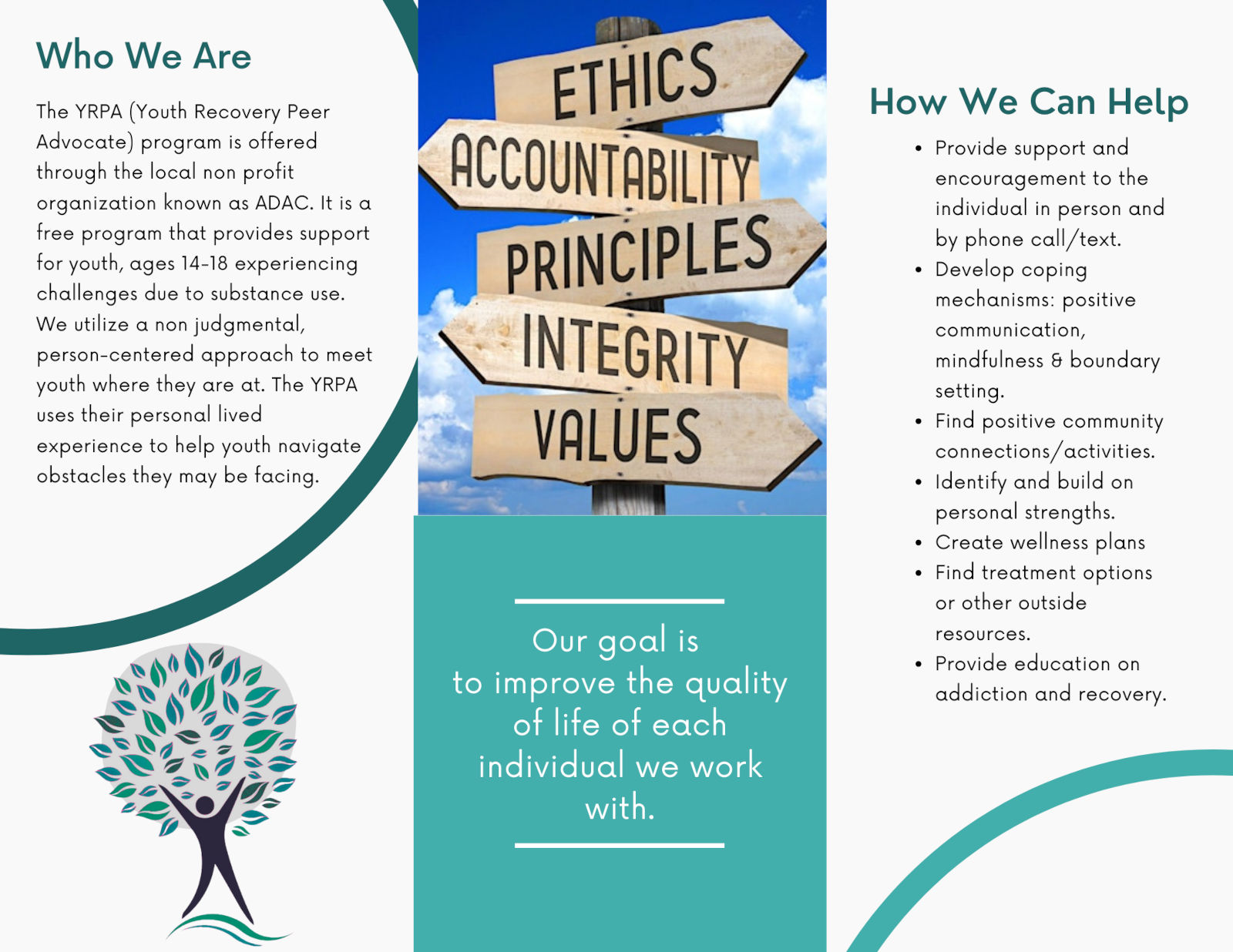 The YRPA (Youth Recovery Peer Advocate) program is a free program that provides support for youth ages 14-18 experiencing challenges due to substance use. We utilize a non-judgmental, person-centered approach to meet youth where they are at. The YRPA uses their personal lived experience to help youth navigate obstacles they may be facing due to substance use/misuse.